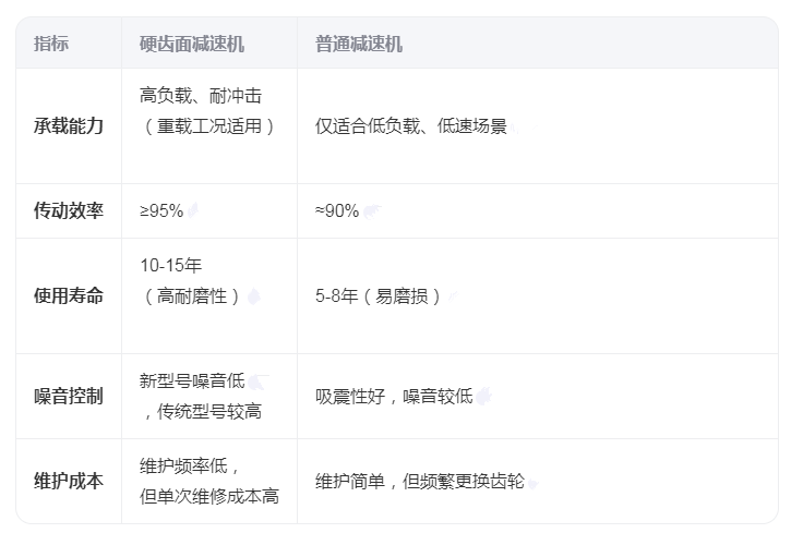 硬齒面減速機(jī)與普通減速機(jī)(通常指軟齒面減速機(jī))的核心區(qū)別主要體現(xiàn)在齒輪材料、工藝、性能及應(yīng)用場景等方面,具體差異如下: